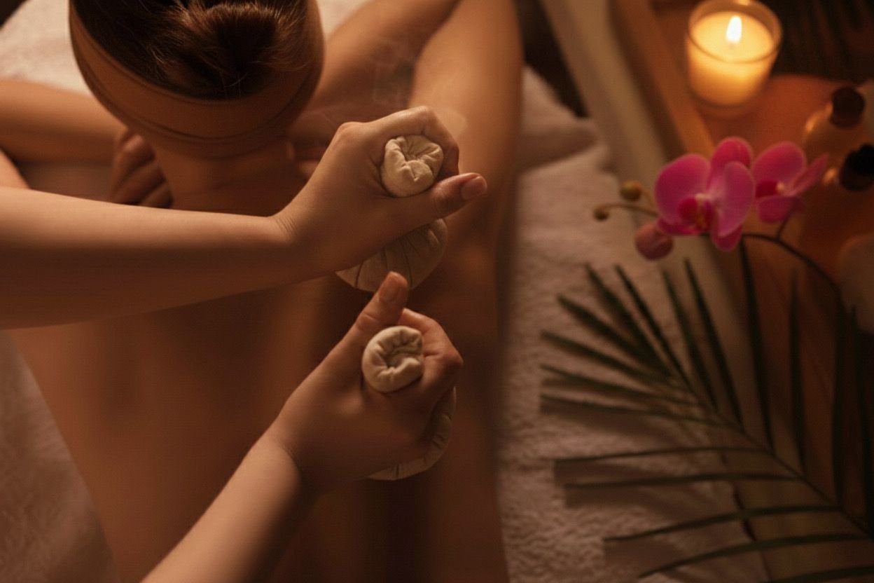 Hot Stones ein, auf Wunsch auch in Kombination mit duftenden Kräuterstempeln.